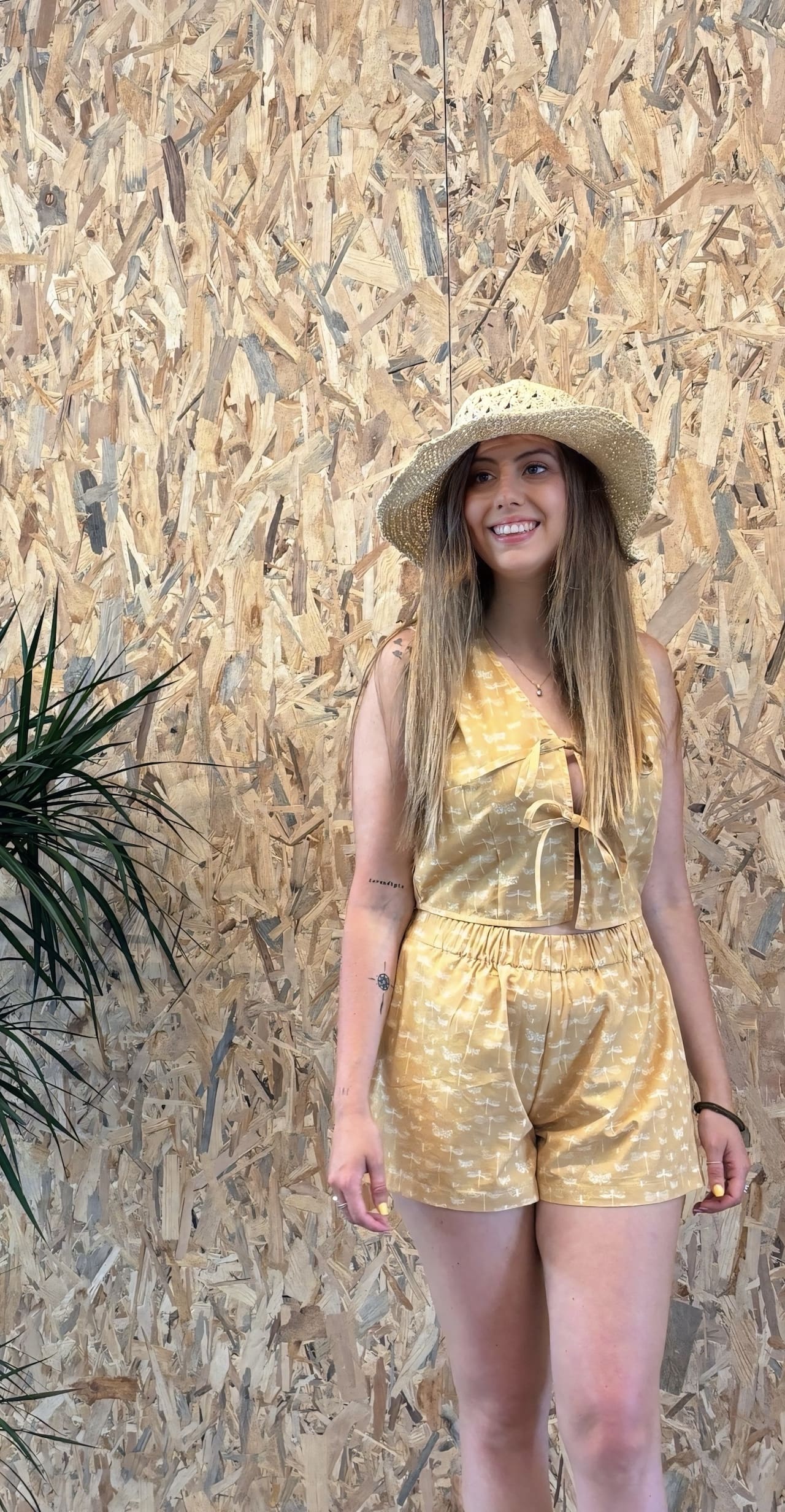 Blusa sin mangas confeccionada en tela de algodón, con estampado de mariposas y libélulas.