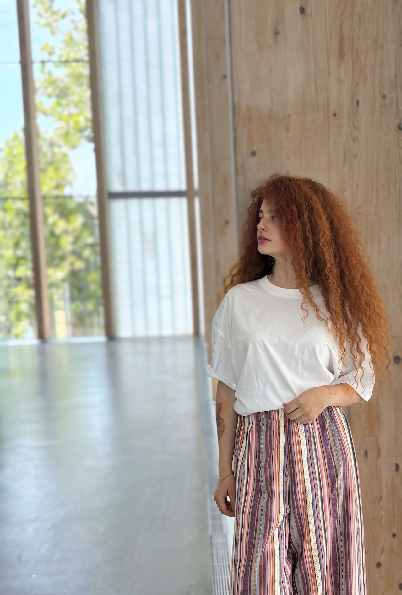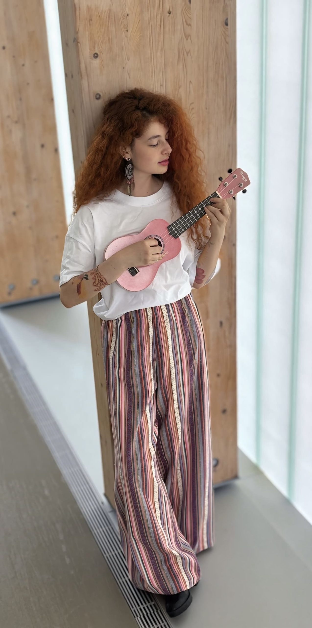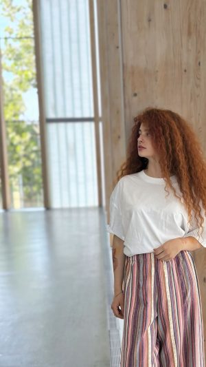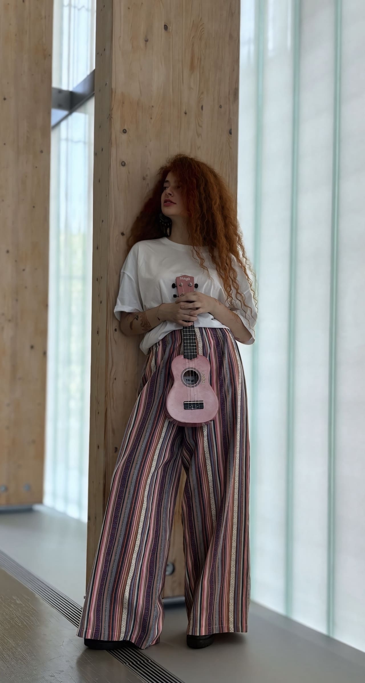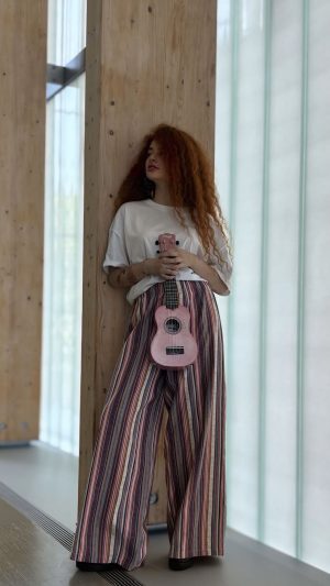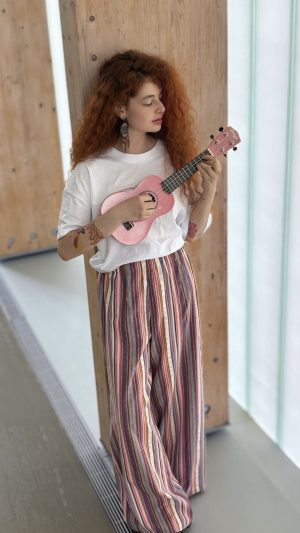 Pantalón fluido rosa multicolor con cintura elástica, cómodo y elegante. Diseño sostenible hecho en España con telas de comercio local.