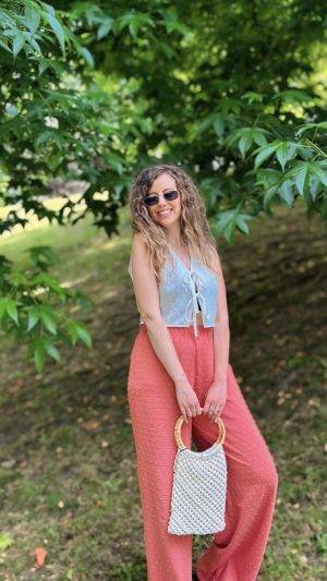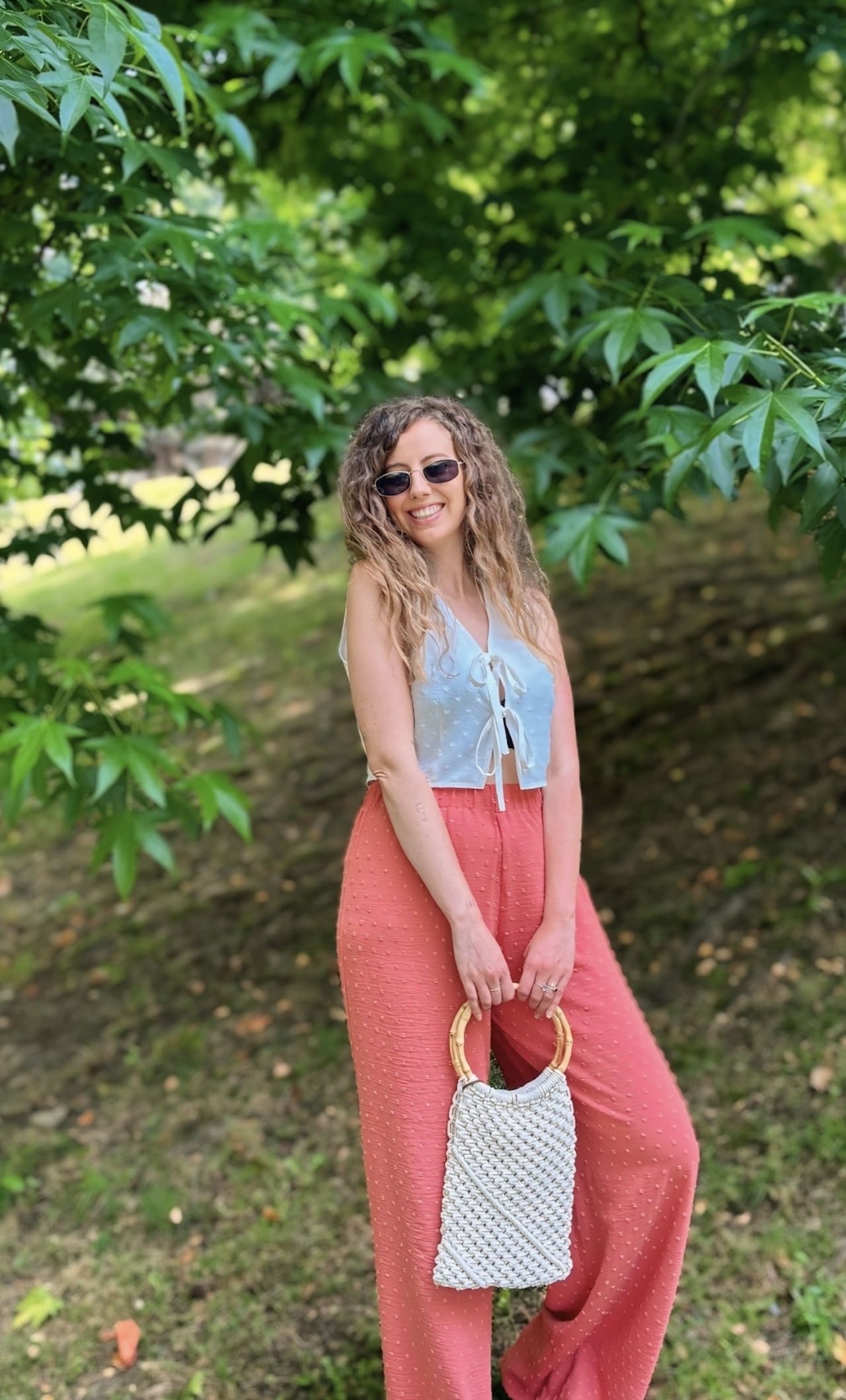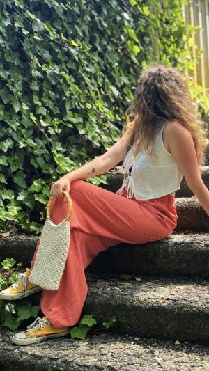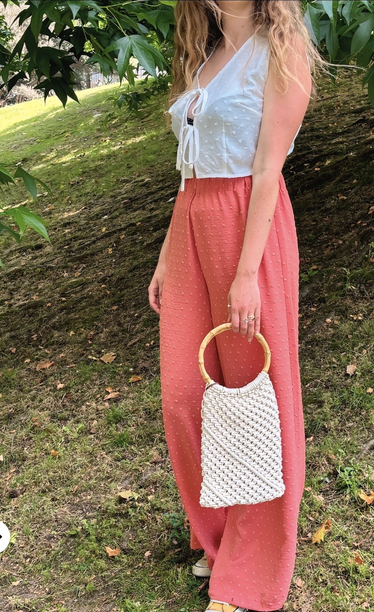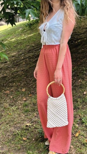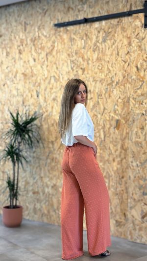 Pantalón fluido rosa coral con cintura elástica, cómodo y elegante. Diseño sostenible hecho en España con telas de comercio local.